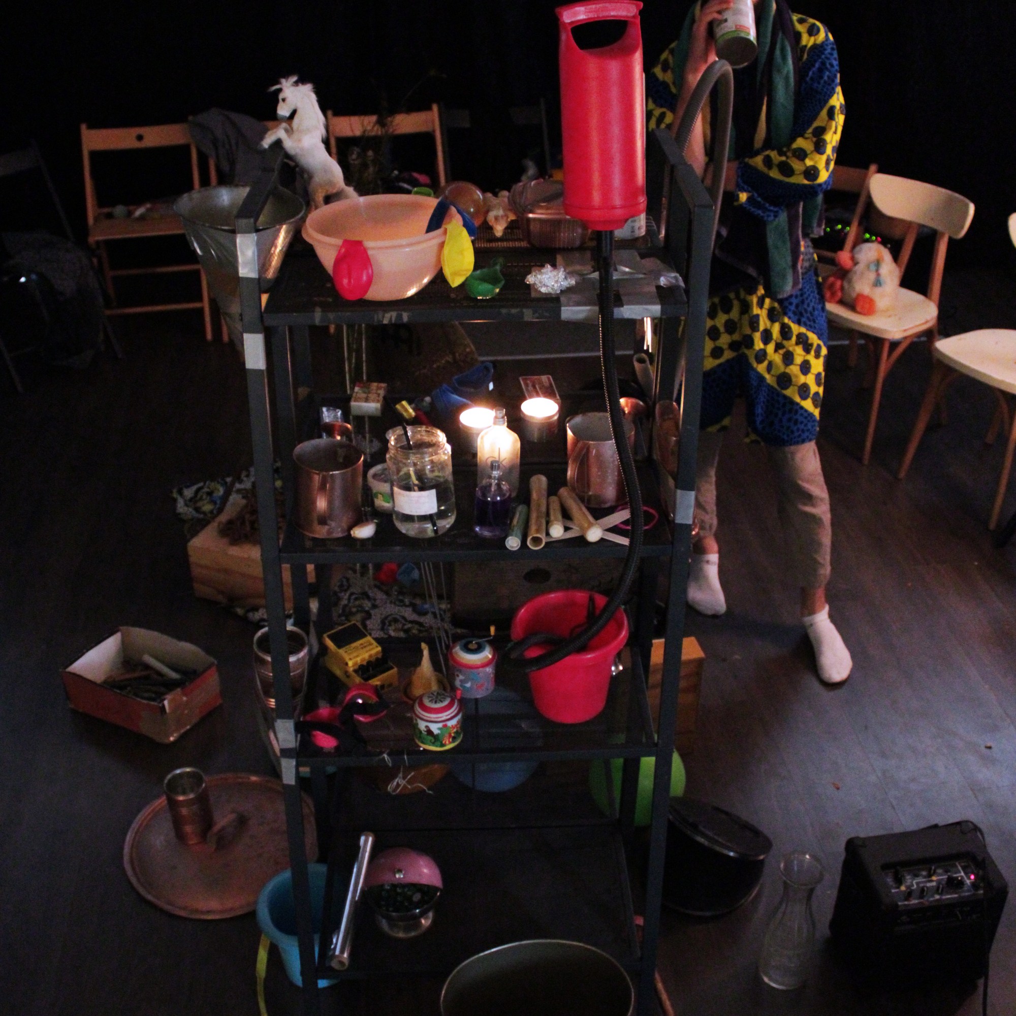 Théâtre du bric à brac, le spectacle s’axe autour de la manipulation détournée d’objets divers, sélectionnés pour leurs propriétés sonores parfois inattendues, pour leurs odeurs, pour leur puissance évocatrice. Sur scène nous sommes trois comédiens/manipulateurs/instrumentistes incarnants le Doc et les autres créatures de ce labyrinthe mental.